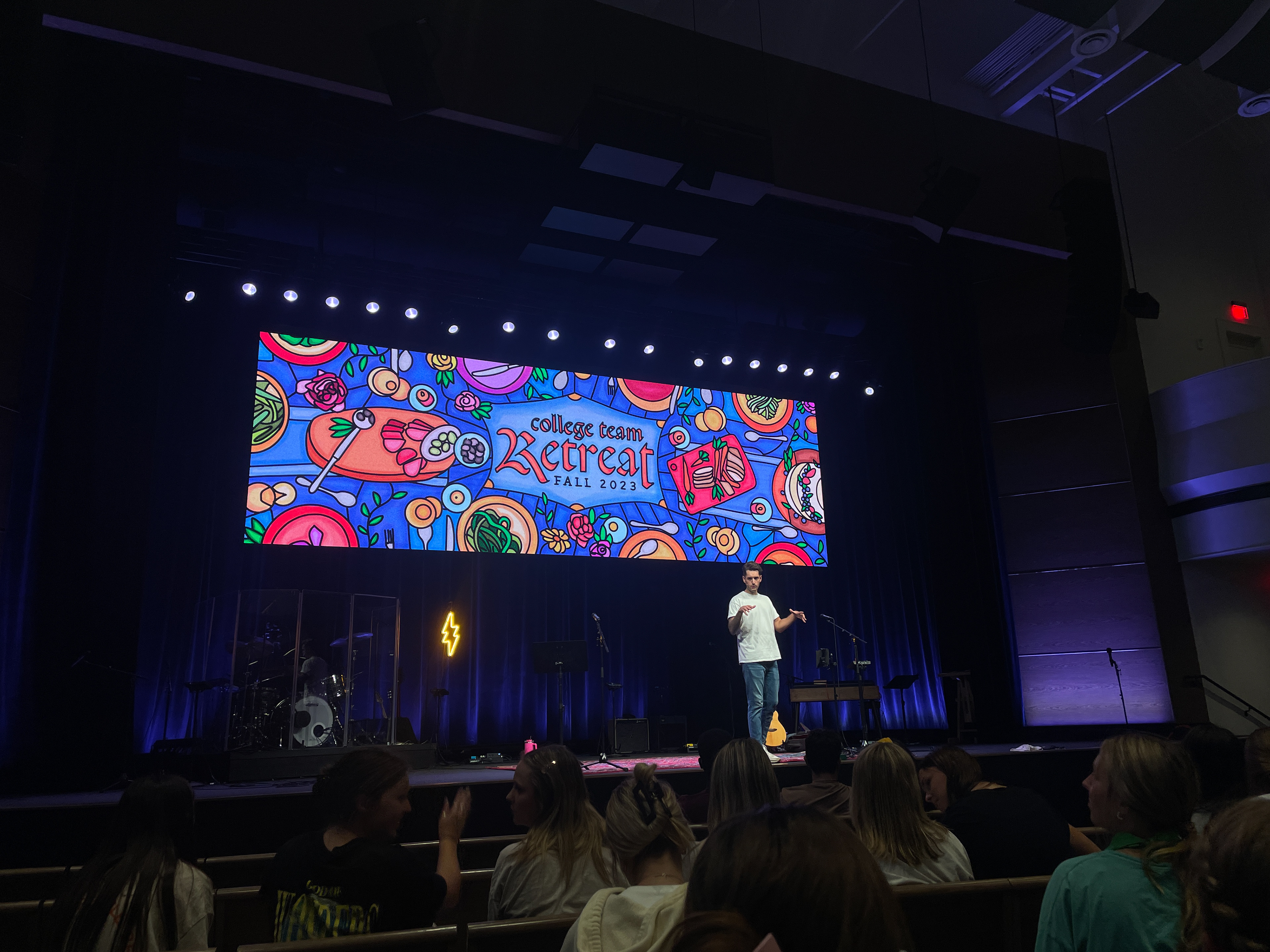 Hand-illustrated as a nod to traditional stained glass art in churches, this branded slide for the College Team Retreat depicts a family dinner prepared for all to come and eat.